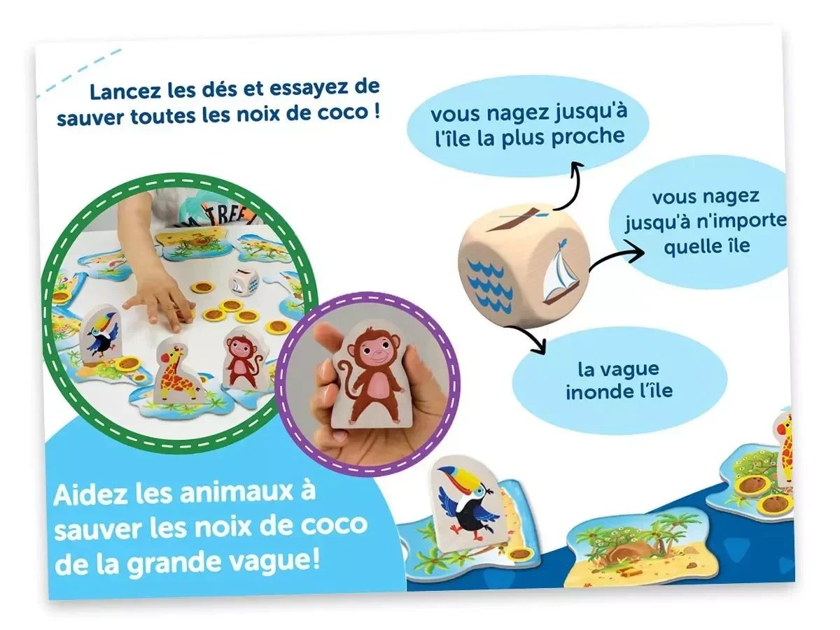 Bienvenue dans Coco Loco, un jeu de société de la collection 1ER JEU, spécialement conçu pour les très jeunes enfants. Dans ce jeu coopératif, les joueurs devront tenter de collecter le plus de noix de coco avant que les vagues ne les engloutissent. Accessible dès 2 ans, le jeu Coco Loco permettra de stimuler et de développer chez l'enfant ses compétences cognitives tout en s'amusant avec ses amis ou sa famille.