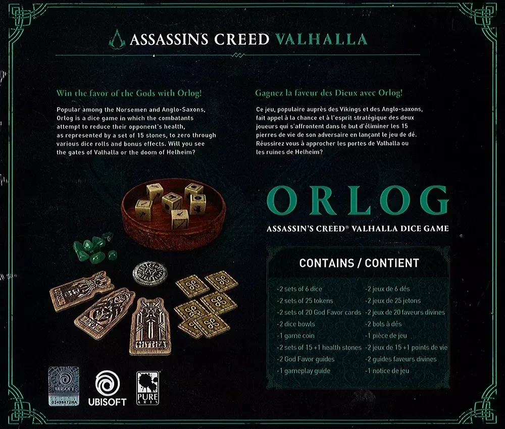Le vrai jeu Orlog tiré de la célèbre licence du jeu vidéo Assassin's Creed ValhallaUn jeu produit par Pure Arts, spécialisé dans les figurines et matériels de collectionsUn jeu de dés accessible à tous