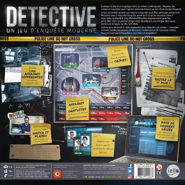 Avec Detective, ressentez toutes les sensations d'une enquête policière. Dans ce jeu coopératif de déduction, travaillez ensemble à la résolution d'une affaire en collectant un maximum d'indices dans le temps imparti. Poussez les frontières du plateau de jeu, en vous connectant au site web Antares ou en effectuant des recherches sur internet.