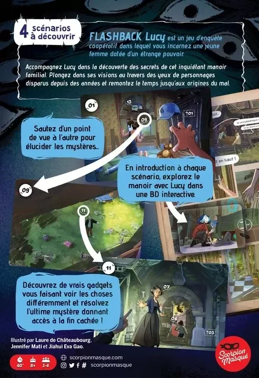Flashback Lucy est un jeu d'enquêtes, d'observation et de déduction pour 1 à 4 joueurs. Dans ce jeu de société inédit qui s'appuie sur une bande dessinée interactive, vous incarnez une jeune fille au pouvoir étrange qui hérite d’un mystérieux manoir dans lequel de sombres évènements se sont passés.