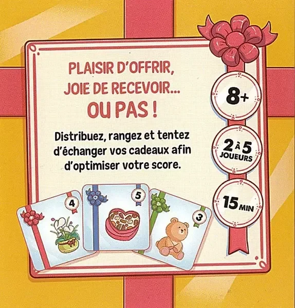 Kado est un jeu de cartes et de bluff simple et rapide pour 2 à 5 joueurs. Dans ce jeu de société, distribuez, ouvrez et rangez vos cadeaux pour réaliser une grille de cartes qui optimisera votre score.