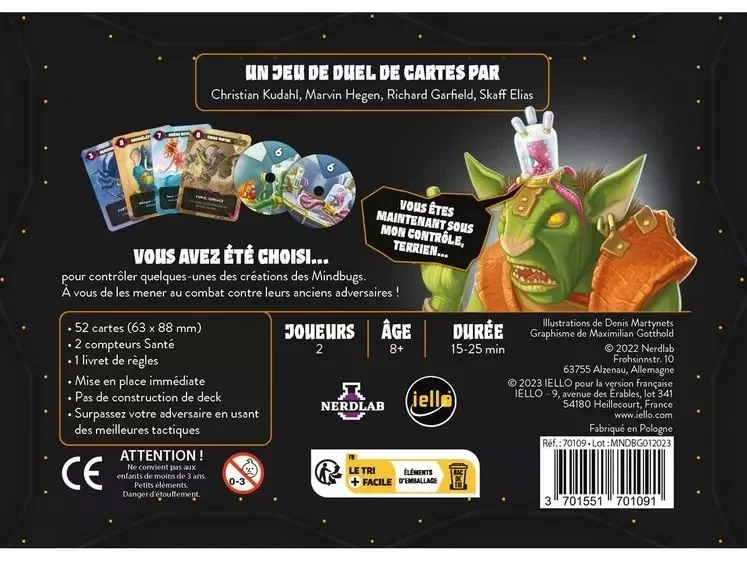 Dans MINDBUG, vous invoquez des créatures hybrides et les envoyez au combat contre les créatures de votre adversaire. Mais faites attention : lorsque vous invoquez une créature, votre adversaire peut utiliser l’un de ses Mindbugs pour en prendre le contrôle. Déjouez votre adversaire lors d’un duel tactique fascinant, dans lequel avoir les meilleures cartes et les jouer au mauvais moment peut s’avérer fatal.