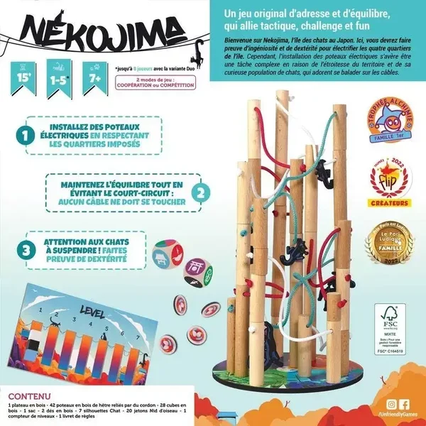 Nekojima est un jeu d’adresse en bois dans lequel il faudra maintenir en équilibre des poteaux électriques en respectant les emplacements sans qu’aucun câble ne se touche. En compétition, le joueur qui fait tomber la structure a perdu. En coopération, le but est d’aller le plus loin possible.