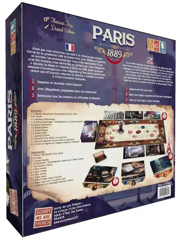 Paris 1889 est un jeu coopératif narratif et d'horreur pour 3 à 6 joueurs, d'une durée de 30 à 60 minutes.