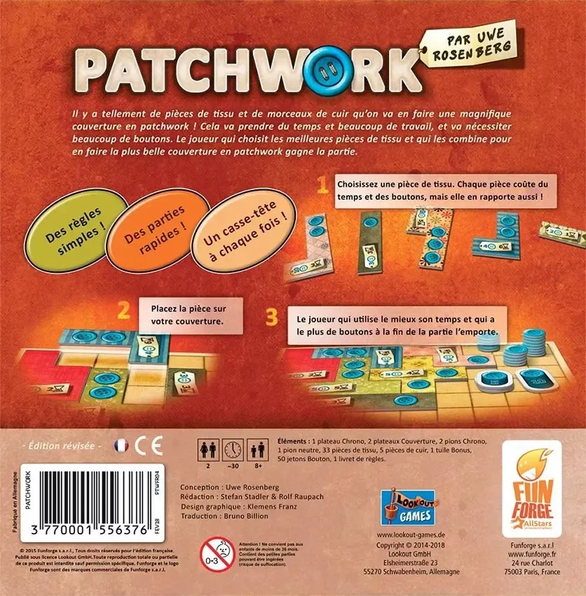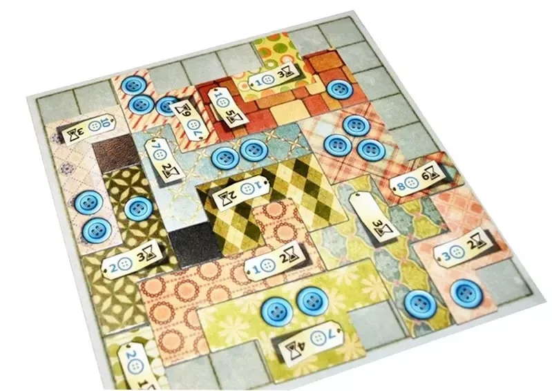 Il y a tellement de pièces et de morceaux de cuir qu'on va en faire une magnifique couverture en patchwork ! Cela va prendre du temps et beaucoup de travail, et va nécessiter beaucoup de boutons. Le joueur qui choisit les meilleures pièces de tissu et qui les combine pour en faire la plus belle couverture en patchwork gagne la partie.