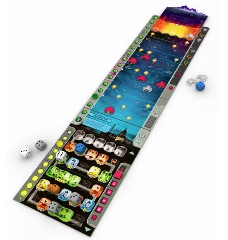 De son côté, le joueur doit optimiser ses lancers de dés en les plaçant à l'intérieur de son bunker souterrain pour développer la riposte. Les dés peuvent être placés sur différentes sections : recherches sur l'envahisseur alien, envoi de chasseurs, déploiement de robots et gain d'énergie. La valeur de chaque dé placé impacte directement vos capacités de production et de défense, et plus vous consacrez de ressources à l'amélioration de votre Bunker, plus votre défense sera efficace. Mais attention : plus vos dés sont forts, plus les chasseurs ennemis vont descendre rapidement !