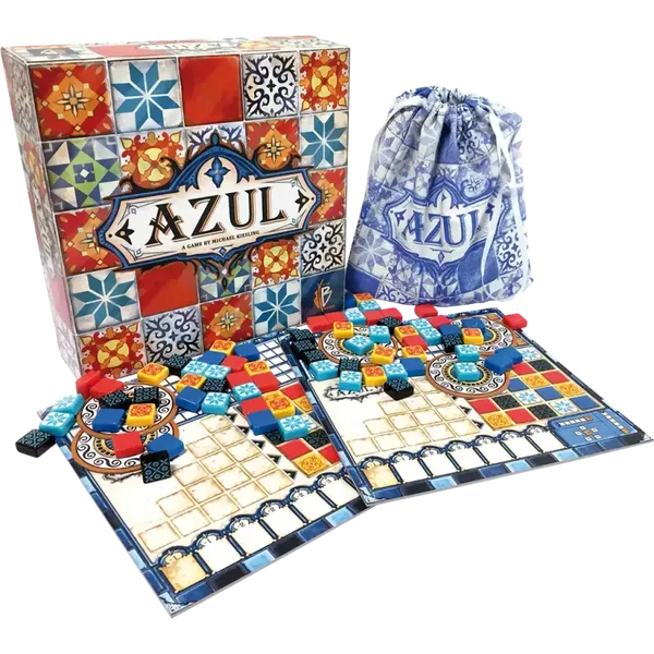 Azul vous place dans le rôle d'un chef décorateur chargé de poser des Azulejos dans le palais du roi Manuel 1er, au XVIe siècle. Chaque joueur dispose d'un plateau composé d'une piste de score, de lignes de motifs et d'un mur de palais. À chaque manche, des tuiles (il y a 5 motifs différents) sont piochées dans un sac et disposées sur des 'fabriques'. À son tour de jeu un joueur va pouvoir prendre toutes les tuiles d'un même motif sur une fabrique et les déposer sur ses lignes de motifs. Quand une ligne est complétée par des tuiles identiques, il peut en poser une sur son mur de palais. En alignant ainsi des tuiles sur le mur du roi, on marque des points. Azul est un jeu de pose de tuiles très malin, qui sort des poncifs habituels du jeu abstrait pour offrir un jeu séduisant et dépaysant.