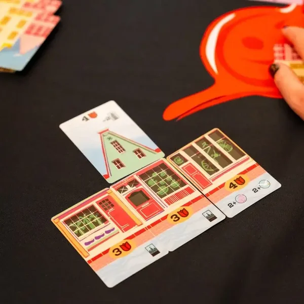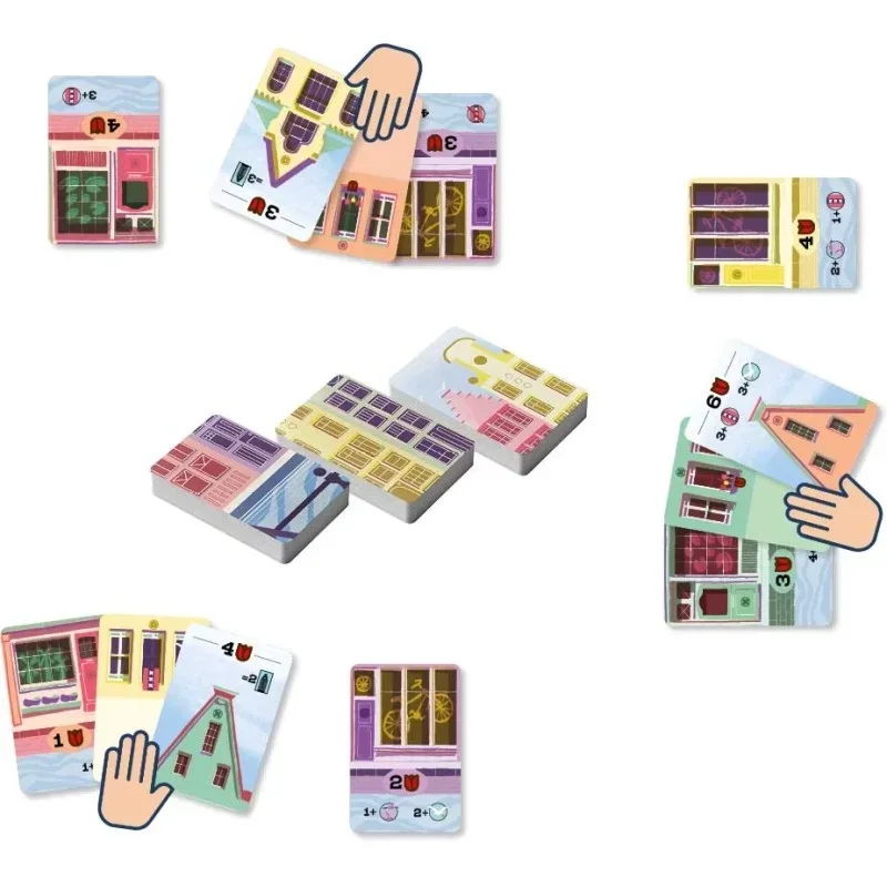 Choisissez la meilleure carte de votre main à poser avant de les passer à vos adversaires. Vous devrez réaliser les objectifs de vos Boutiques et de vos Toits, tout en gardant un œil sur les couleurs afin de marquer le plus de points et de remporter la victoire !